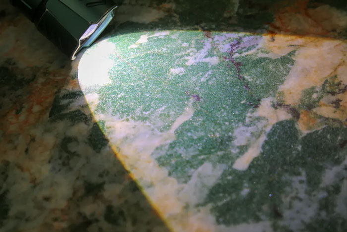 项目通过特殊的釉料配方,经喷雾造粒后,协同数码定位、全抛干粒釉工艺,使光线在透明釉层中发生色散,实现了定位多彩炫光的釉面装饰效果,高度还原天然奢石的晶质感和色彩饱和度。